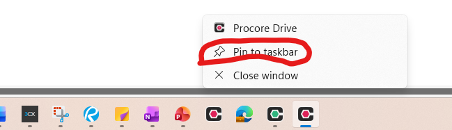 - Right click and select Pin to Taskbar to pin the new Procore drive to your Taskbar. Unpin the old Procore drive.
