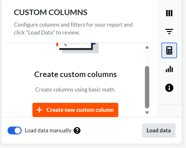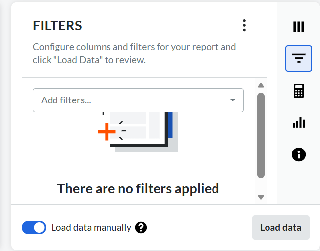 By default, manual loading is ON. After changing columns, filters, or groups, click Load Data to see your updates. For automatic refreshes, turn the Load Data Manually toggle OFF. When ON, reports may require longer load times.