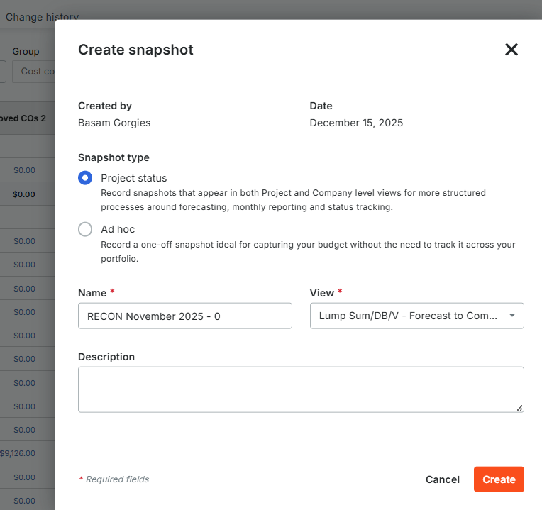 Each monthly forecast produced should be saved, once the forecast has been finalized, by selecting + Create then Snapshot and saved using the standardized labelling below.