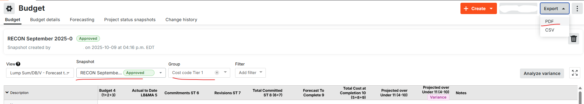 In order to do so, from your “Snapshot” drop down you will select the Recon Snapshot you have just saved. Under Group, select Cost Code Tier 1 as shown below to group the budget codes by divisions and then select “Export” and “PDF”.